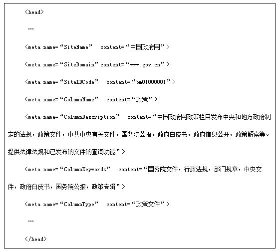 網頁標簽是指網頁模版中對有關展現內容進行標記而設置的標簽,通常包括網站標簽、欄目標簽、內容頁標簽等。政府網站要在頁面源代碼“〈head〉…〈/head〉”中以meta標簽的形式,對網站名稱、政府網站標識碼、欄目類別等關鍵要素進行標記,標簽值不能為空。